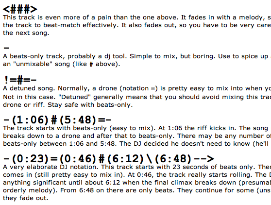 This one blew my mind when I first saw it, and if you don’t count yourself as a geek, I suggest you skip to the next section now! Still reading? Then have a look at the DJ notation system here, which as far as I know is unique.