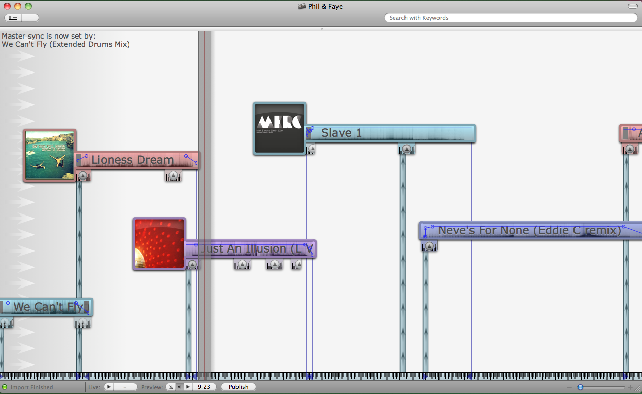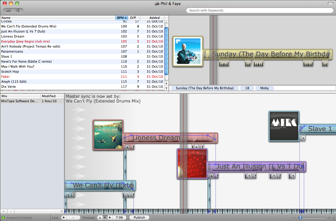 When you want to add a track to the mix, you drag it into the main (bottom) window. There’s also, by the way, a smaller window to the left of this that shows all the mixes you’ve got stored – you can show or hide this (or the other) windows at will.
