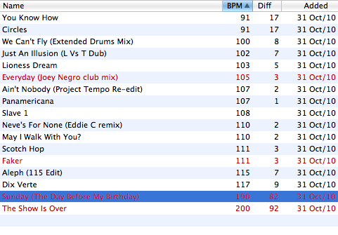 You can’t choose the fields it shows here – apart from the BPM, you get the title, the difference between the current BPM of your mixtape and the tune’s own BPM (more later), and the date added. I would like to be able to add the artist here and definitely the key or the comments tag – I mix in key and have that information in the ID3 tags, and I don’t want to have to refer back to iTunes to get this.