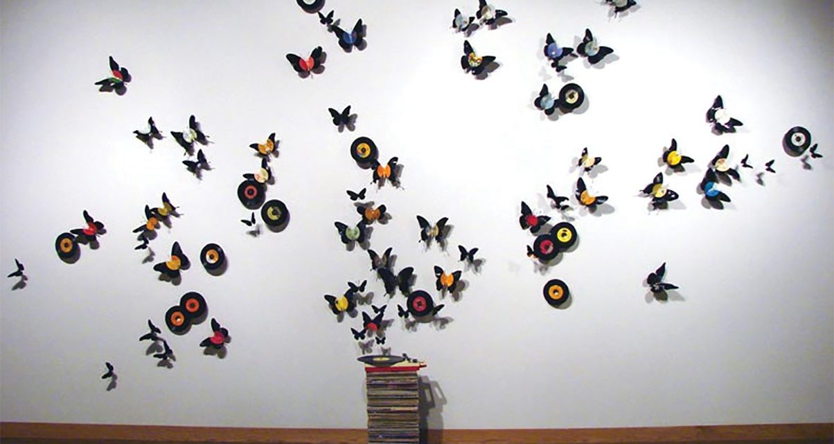 “Paul Villinski’s amazing installations embody everything that is positive about music, showing flocks of brilliantly colored vinyl butterflies seemingly emerging from old record player turntables.