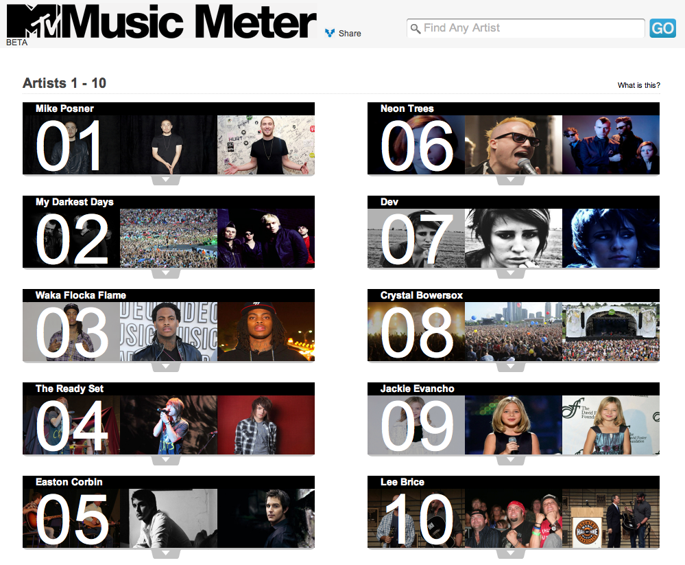 Also, use services like The Hype Machine and the new MTV Music Meter to assess blog/social buzz and bring you current genuinely hot tunes and acts.