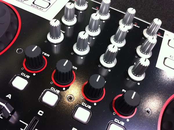 It has microphone input with tone; booth and master outputs; four filters like the S4; big cue, looping and transport buttons in a 12-button layout under each jogwheel (similar to the just-announced Novation Twitch); full four-deck mixing; library browse; obviously a built-in soundcard – in short, it’s modern controllerism, on a budget.