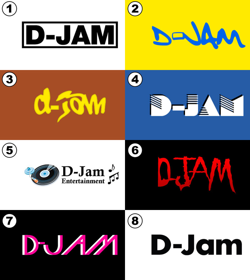 The image here is my name in eight different variations, based on actual logos I’ve seen out there. Logo #1 is a copy of how Armin Van Buuren does his logo. When you first saw it, did you think “trance DJ”? Or maybe “hip-hop DJ”, since it seems similar to Run DMC’s old logo. I’m sure if my name was “Dee Van Jam” it would say “trance DJ”. Logos 2 and 3 could be construed as possibly as “hip-hop”, based on how they look like they could be graffiti tags. #2 is actually a font Fatboy Slim uses, thus showing how he might not have come off as “breaks/big beat” had he not gotten famous first.