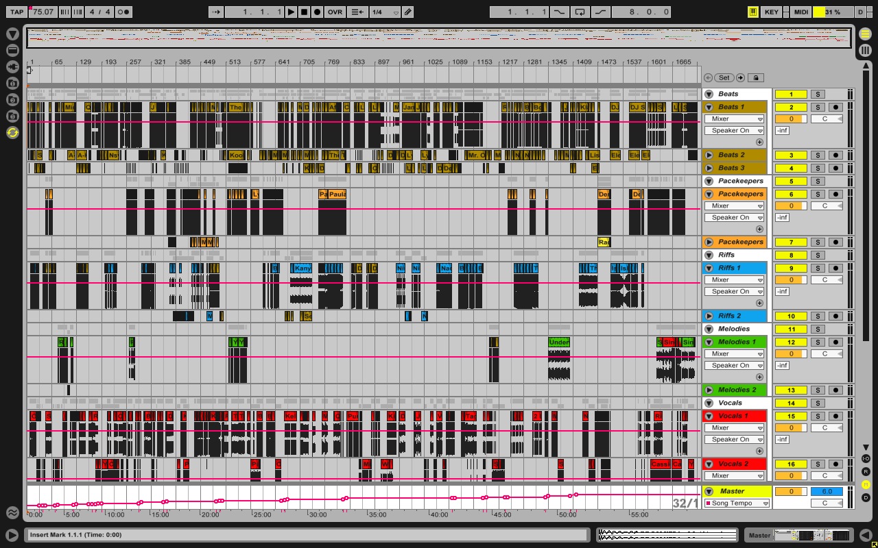 My scenes are also coloured for visual aid about the “loopability” of parts. Green is for scenes that loop 100%. Yellow for scenes that loop well. Orange for scenes that loop okay. And finally, Red is for scenes that that don’t loop very well. These scenes that loop poorly, generally do so because they have pickups to the next scenes at the end. When this is the case, I colour the infringing clips in white. So if I really want to loop certain scenes that might not loop that good, I’ll just mute the channels where these pickup clips are.