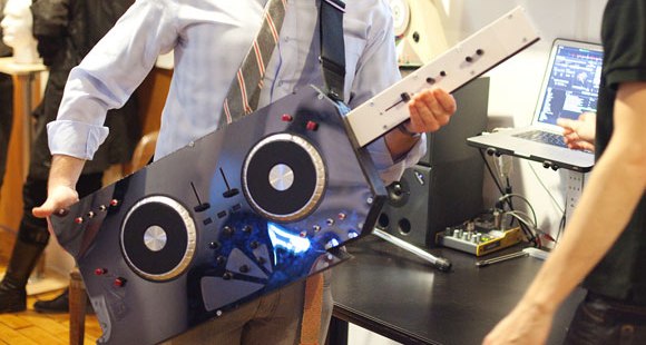 Part turntables/controller and part “guitar”, with a crossfader where the strings would normally be and two jogwheels taking the lion’s share of the space on the body, this apparently working prototype allows the DJ to mix while larging it up like a guitarist.