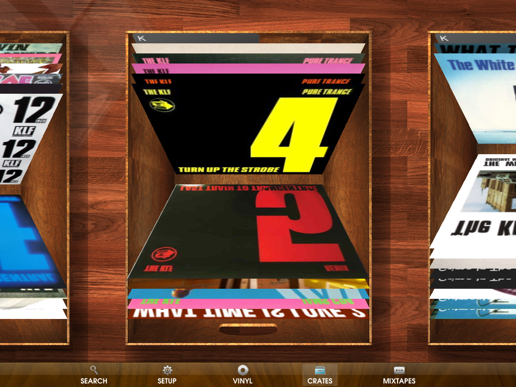 The first thing that hits you is that the app is well designed and features gorgeous graphics throughout. To select a track to play on the deck, you trawl through wooden crates (accessible via the “Crates” button at the bottom) which look as if they’re positioned on a polished wooden surface. It’s strange to describe, but there’s something reassuring about digging through crates – even if they’re virtual ones!