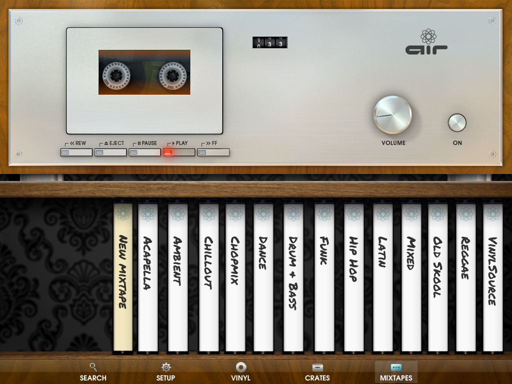 The other method to play audio back through this app is with the mixtape functionality. This takes the form of an old (but again stylish) cassette deck, complete with counter display and brushed aluminium finish. The cassettes along the bottom represent “Mixtapes” – by default they show your playlists.