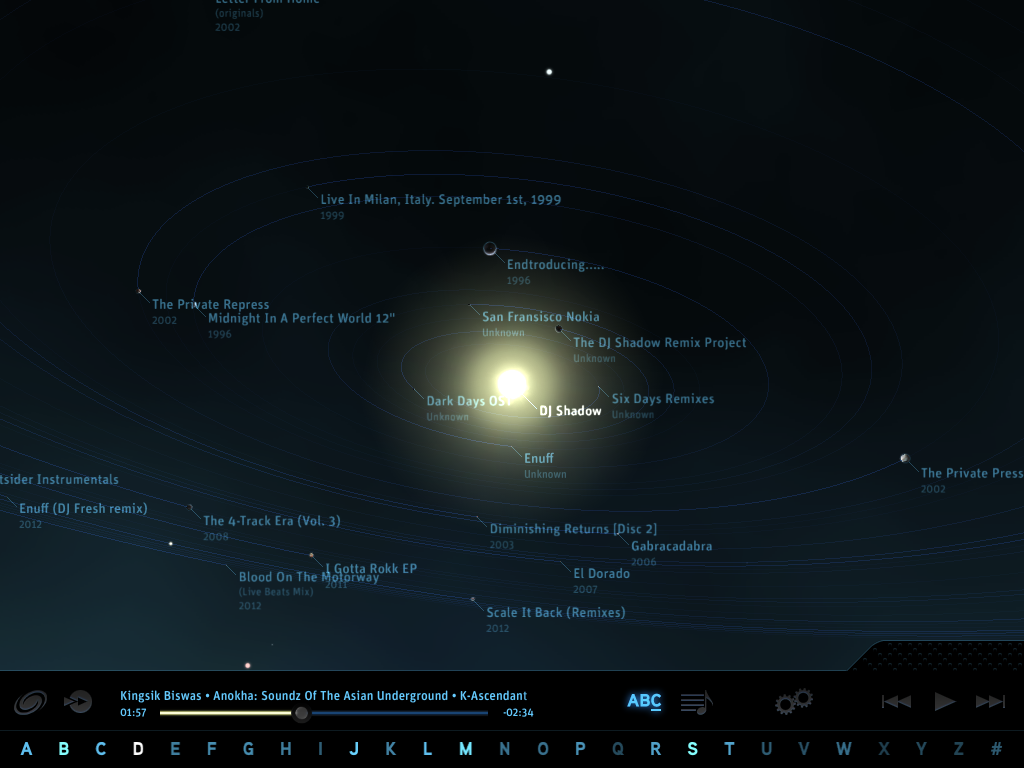 The pinch gestures allow you to zoom in/out of the constellations and swiping your finger can rotate the displayed items around the central point. If you are on an iPad 2 then the gyroscope can be used to navigate around by tilting the device. You can view the universe grouped by album, artist or playlist with a handy index displayed along the bottom of the page.