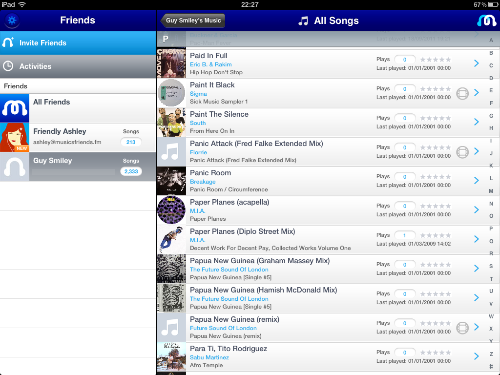 The initial page is sparse, because at this point you have no friends (honestly, this isn’t a true reflection of my personal life!). To add friends you need to invite them. If you send an invite via Twitter or Facebook it could be anyone following you, so be warned… if you have a secret stash of Justin Bieber tracks on your device then maybe this is not a route which you want to take!