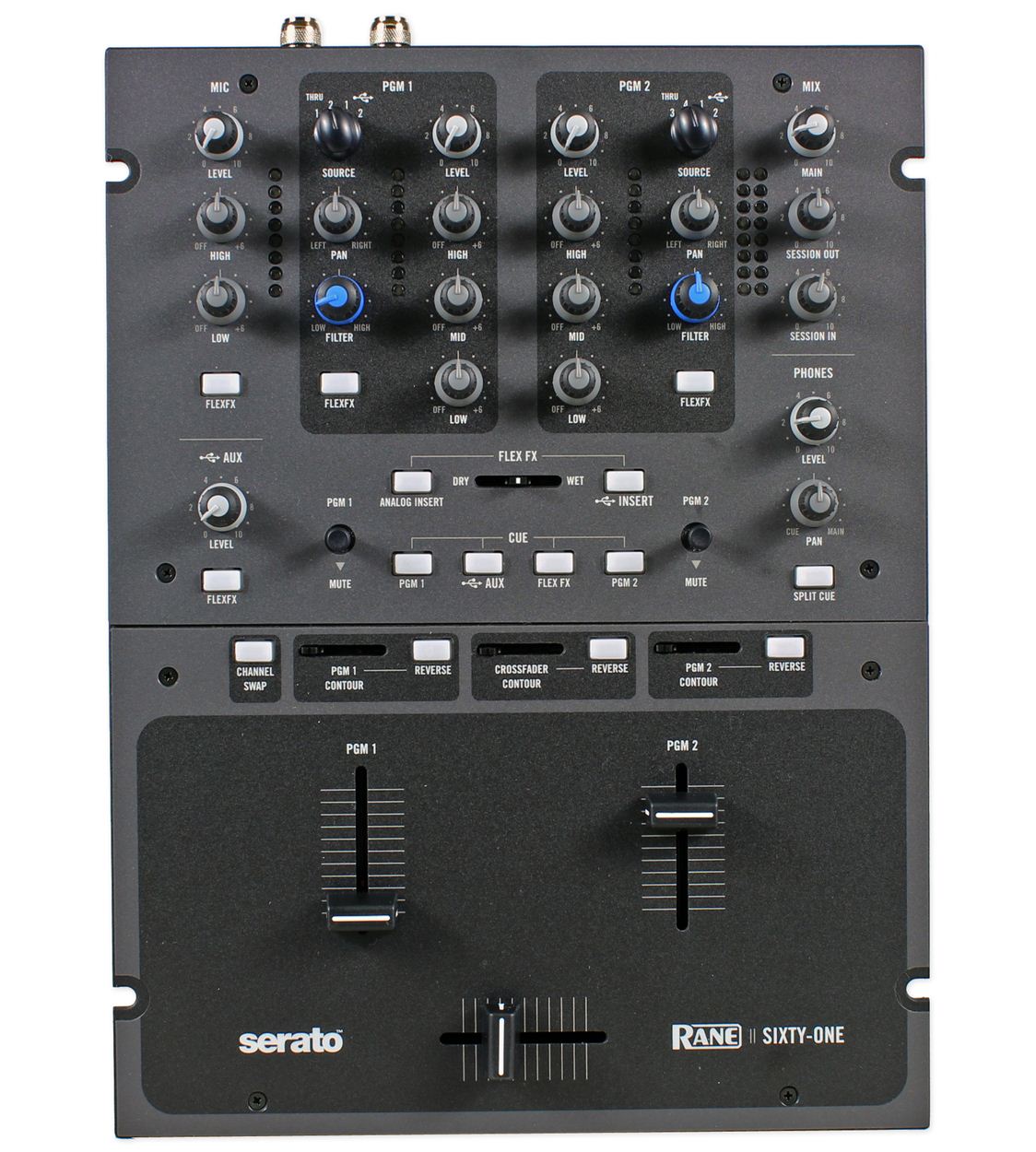 Rane doesn’t produce shoddy gear, and it doesn’t produce cheap gear, either; on unboxing (and checking the price – a cool US$1,400) it is clear that the Rane Sixty-One continues the tradition. It’s an understated mixer, appearing at very first glance like any full-sized two-channel DJ mixer. It is metal, but not over-heavy, and painted in a sober grey and black colour scheme.