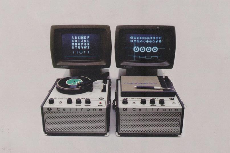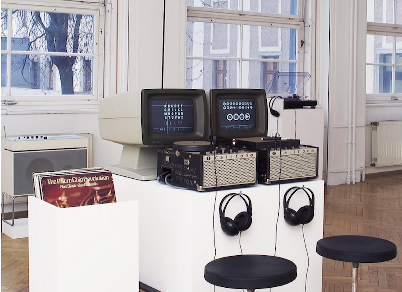 It was made from two old workstation monitors from Hewlett Packard and some US Army record decks from Califone. The installation came complete with its own record collection consisting of classical orchestral works, commercial advertising record, and recordings of pioneers in electronics, right up to (of course, this is Germany) some techno and rock. Material, the installation artists said, which covered “varying degrees of coolness”. You were meant to walk up to it and sample bits of tunes into the loopers, adjusting pitch and frequency (yup, it had timestretching too).