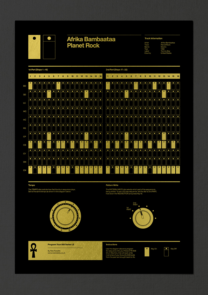 Rob Ricketts (a freelance graphic designer from Birmingham) has developed an enchanting series of high quality posters showing the basic drum patterns used in some of those era-defining tracks. If you want to add a touch of class to your studio or bedroom, then one of these will do the trick… who knows, it may inspire you to produce something yourself! I’m hoping there will be a TB-303 spin-off soon.