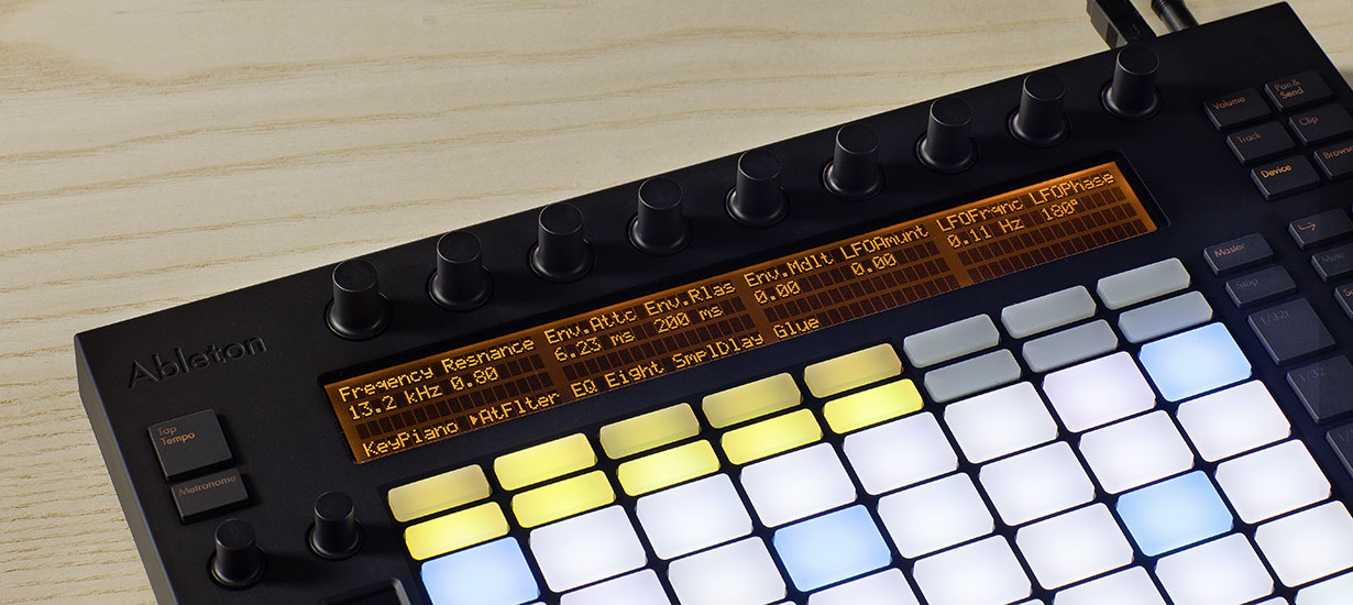 The rotary knobs above the LCD screen control a variety of parameters in Live depending on what you set it it on. You can change their behaviour simply by selecting the parameters on the bank of buttons to the right of the LCD, including Volume, Pan & Send and Track focus.