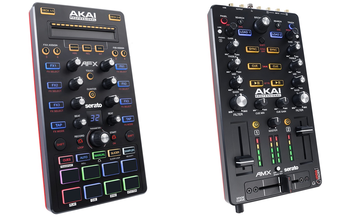 Akai is the latest music brand to get on board the Serato train, with two intriguing new USB-powered portable modular DJ controllers announced today, the Akai AFX and Akai AMX. The AFX is like a cross between the Traktor Kontrol F1 and Traktor Kontrol X1 having performance pads, FX controls and a touchstrip, while the AMX is a two-channel mixer with built-in Serato DVS compatible audio interface, kind of like the Traktor Kontrol Z1 but with transport controls and audio ins. Full descriptions, prices and image galleries for both follow…