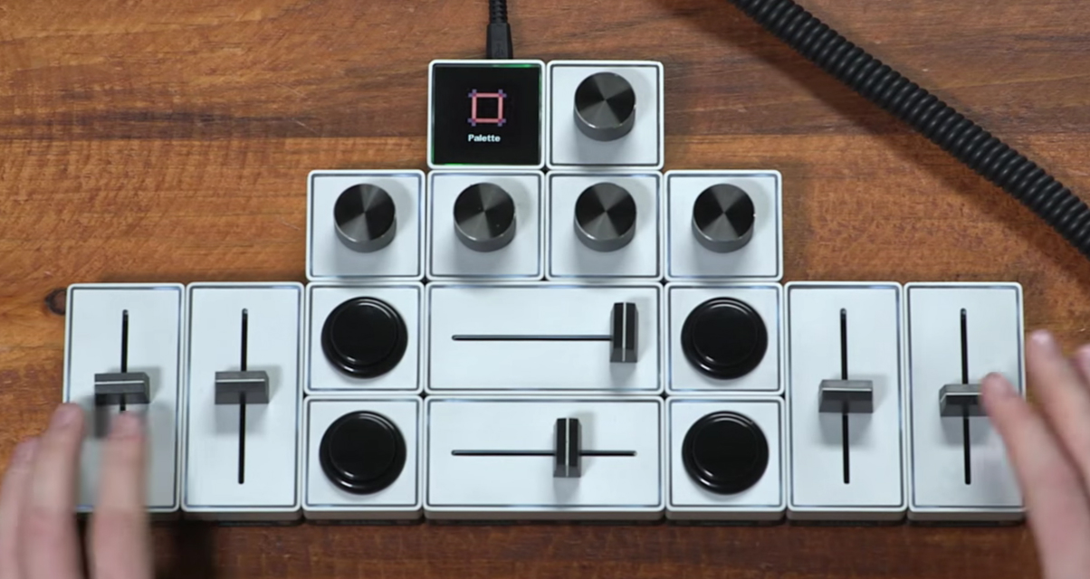 A new modular controller called Palette has started to ship. Made up of fader, knob, and button modules that snap together via magnet, Palette hooks up to your laptop via USB through its core module, which is the heart of the entire system. You then build your controller around it, adding up to 18 modules in total. It comes with an app that you run on your PC/Mac, which acts as the conduit between Palette and your software.