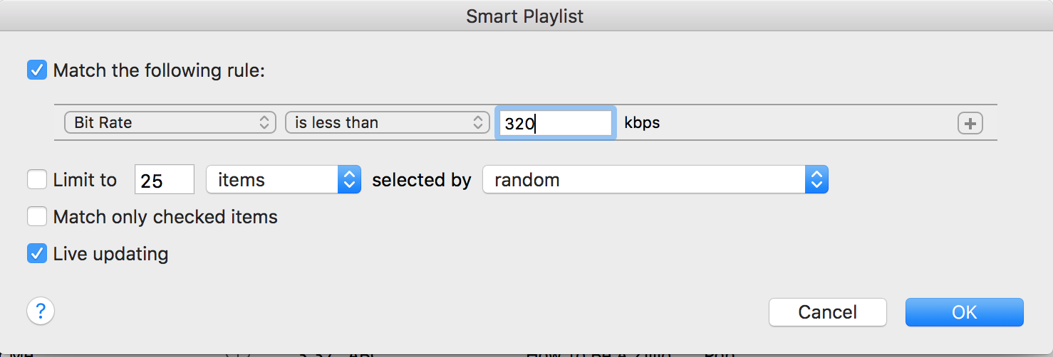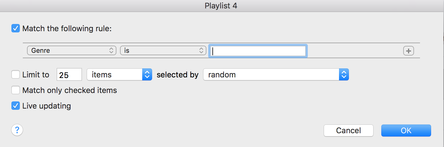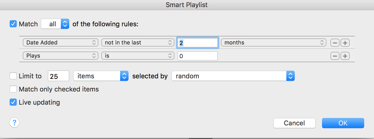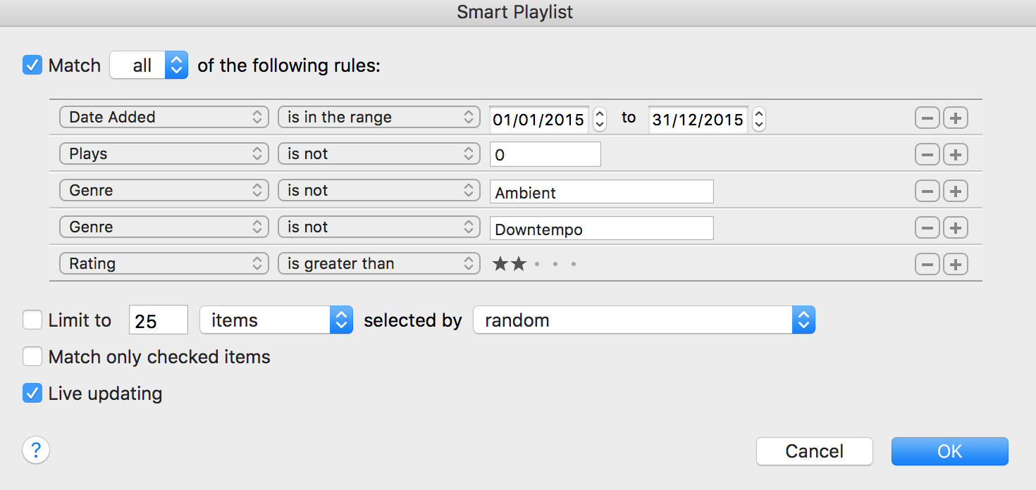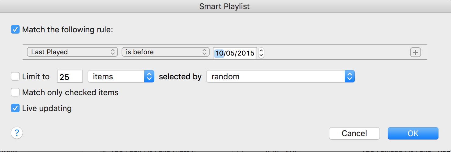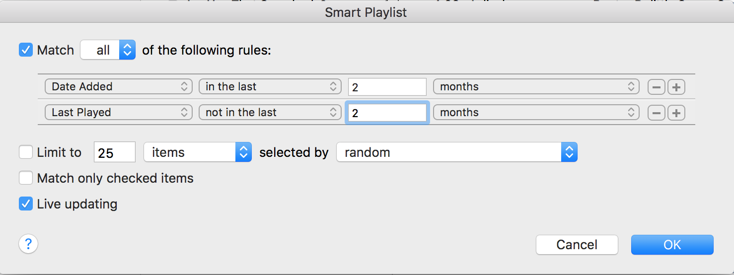 Smart Playlists are a great feature of iTunes. Whereas a normal playlist is “manual” – you add tunes to it yourself – a Smart Playlist can be set to automatically update itself with tunes that fit one or more rules you choose. So as you add new tunes to your collection, your Smart Playlists update accordingly. You can play from them inside your DJ software, or use them to help you explore your collection in iTunes itself.