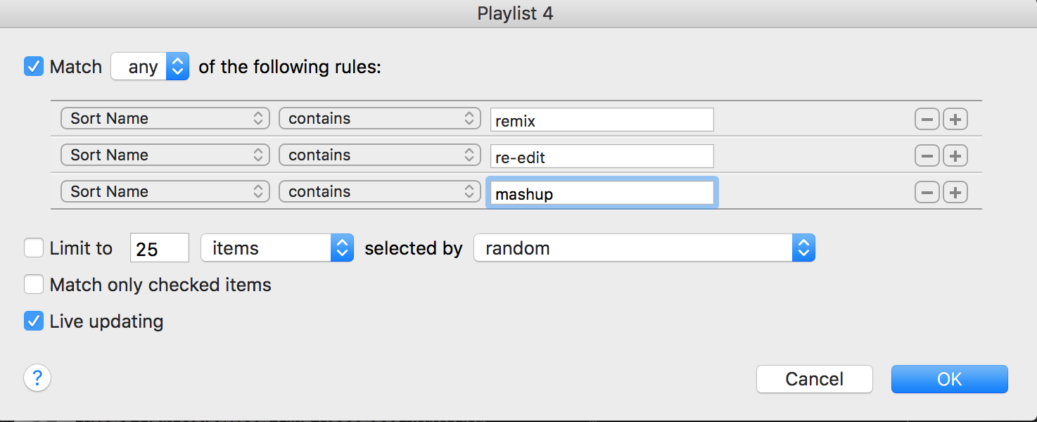 These are valuable to the DJ because they let you play your style, while keeping people who wouldn’t normally be interested, well, interested. By filtering all tracks with “re-edit”, “mashup”, “remix” etc in their titles into a Smart Playlist, you can make a list of potential tracks for further auditioning or to work out weaving them into your mixes.