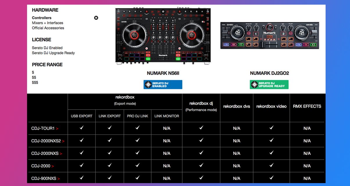 Serato DJ: 53 controllers, 17 mixers, 18 accessories (including CDJs), four DVS boxes