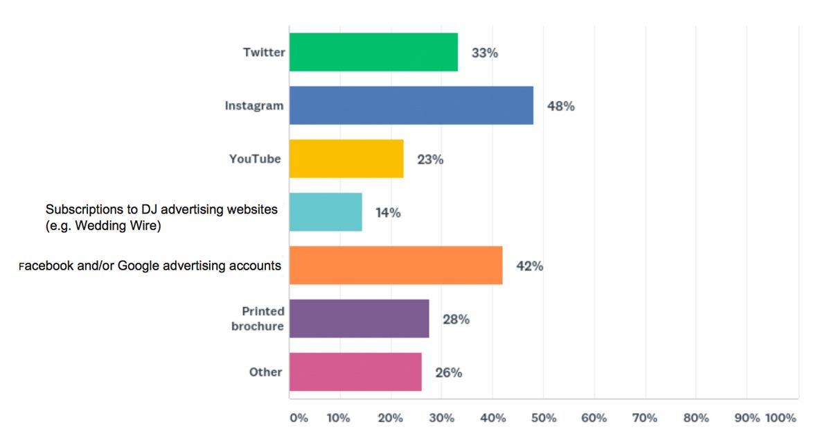 Social media is a key component in marketing your mobile DJ business, and of all the platforms out there most of our survey respondents are on Instagram. Noticeably absent is Pinterest (perhaps covered in the “Others” category), which is an area of growth for mobile DJs because wedding planners and brides love using Pinterest to come up with mood boards, palettes, and design ideas. If you’re not on it, you may want to consider adding Pinterest as part of your online marketing efforts.