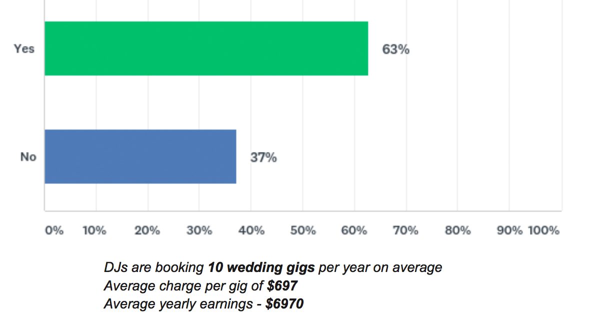 Weddings are a big source of income for mobile DJs – 63% of our respondents played a wedding in the past year, charging an average of US$697 per show. Apart from nuptials, there are other types of mobile DJ gigs to be had (though you probably won’t find as much attractive bridesmaids / groomsmen…).