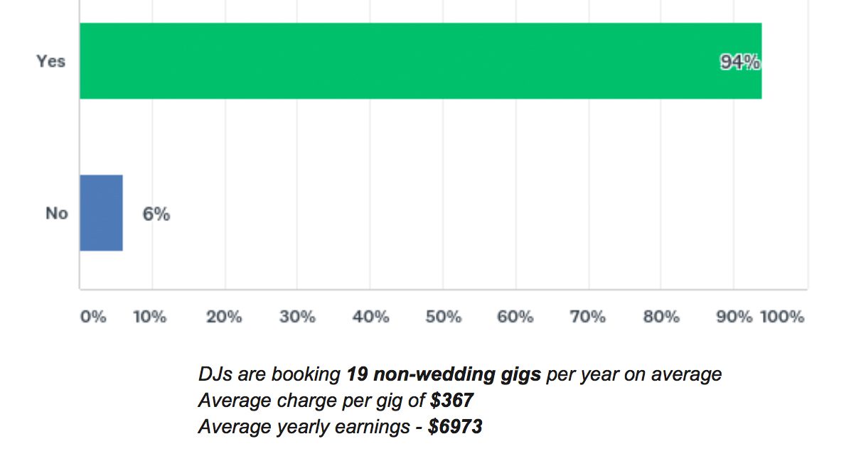 Functions, birthdays, even bar or pub DJ gigs where you bring your lights and sounds are income generators for most of our mobile DJs, with only 6% of our respondents doing nothing but weddings. Talk about laserlike focus!