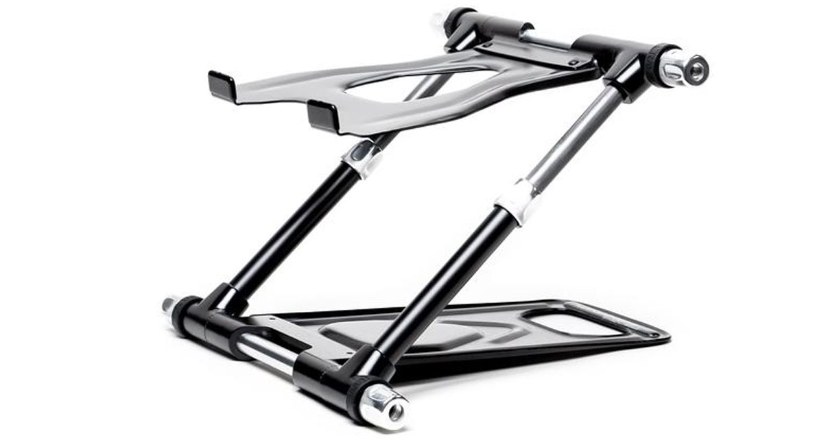 It also lets you maximise the space on a DJ desk or booth because it gives you a “floating” platform on which to hoist your laptop on – handy for cramped booths where surface area is a premium.