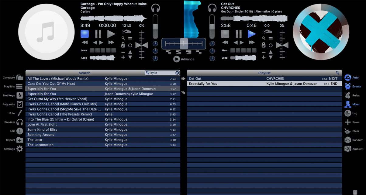 MegaSeg is what you get at the intersection of DJing and broadcasting. It primarily services radio DJs and the hospitality / restaurant space. The interface is a bit dated, but it’s got some serious playlisting and programming power under the hood: it lets you schedule songs, do automated segues, and play voiceovers kind of like what you’d do if you were working at a radio station. Of course, it’s also got more traditional digital DJ features such as video playback, a sampler, onboard effects and manual beatmixing. If you’ve always dreamed of starting and running your own internet radio show, it’s a great way to get a feel for what programming a show might be like.