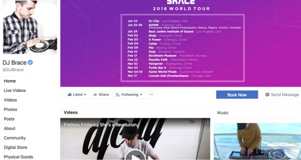 A DJ/producer and the 2016 DMC Online World champ with 82,000 fans and counting, DJ Brace maximises the real estate on his page like a total pro. The cover photo features his 2018 world tour dates, and being a performer, videos are front and center. In addition to doing everything mentioned prior, Brace features travel updates, shares videos from other DJs, and has created a series called “Fretless Fridays” that gets serious views.