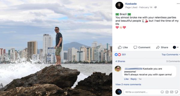 Voted America’s Best DJ in 2011, it’s no surprise Kaskade has nearly 2 million Facebook fans… if only it were that easy. While you might not have that many to start, there are things to glean from his page. Instead of a photo, he has a cover video showing footage of him performing. His aesthetic (read: brand) is consistently on point. In terms of content, he posts the usual suspects alongside non-DJing clips, hashtags, and funny content. Do you think those 2 million fans would stick around if his page was a boring mess? Nope!
