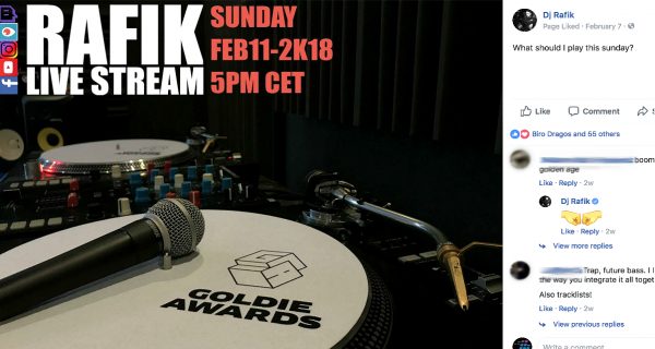 Six-times world champion. Club and festival DJ. 60,000 Facebook fans. Click on his page to see a classy black and white aesthetic across his profile and cover photos, with the latter featuring him rocking a crowd. The tabs along his page feature all the usuals plus “Mixes & Downloads” and “Instagram” which populates his feed from that platform. DJ Rafik posts consistently and mixes it up with throwback pics, photos with other DJs, and free track giveaways. He hosts regular Sunday performance livestreams, followed by a “tracklist” post giving his audience the inside scoop. He gets tons of reactions, comments, and shares, but most importantly he replies to every single thing.