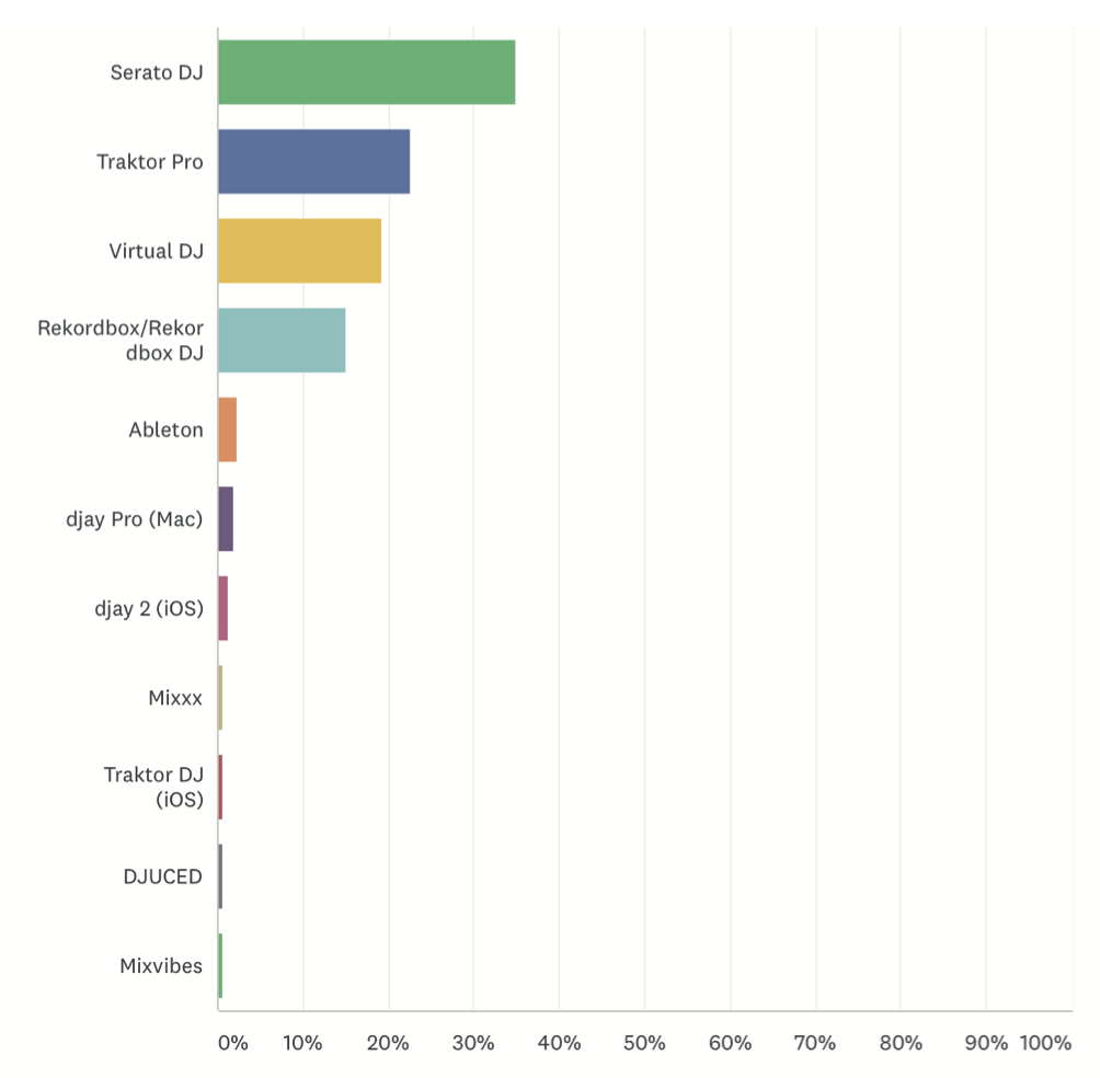 The “Big Three” are still the most popular DJ apps in our survey, with Serato DJ being the number one DJ software of choice for our readers. Traktor Pro is still a close second, and Virtual DJ third, with Rekordbox DJ climbing into fourth place and pushing Ableton Live further down the ladder. Will it become part of the top three this year?