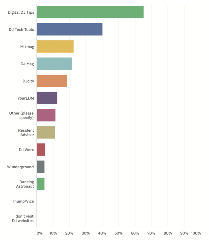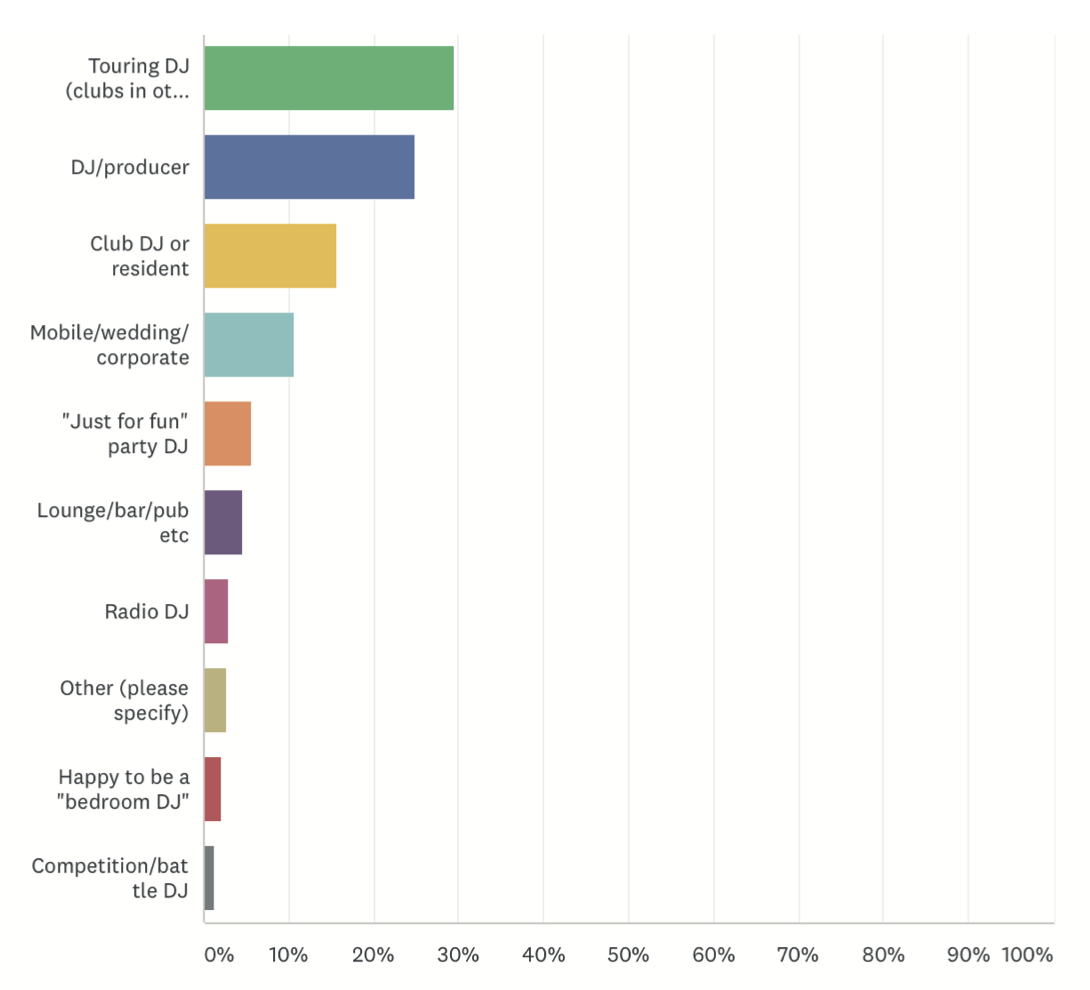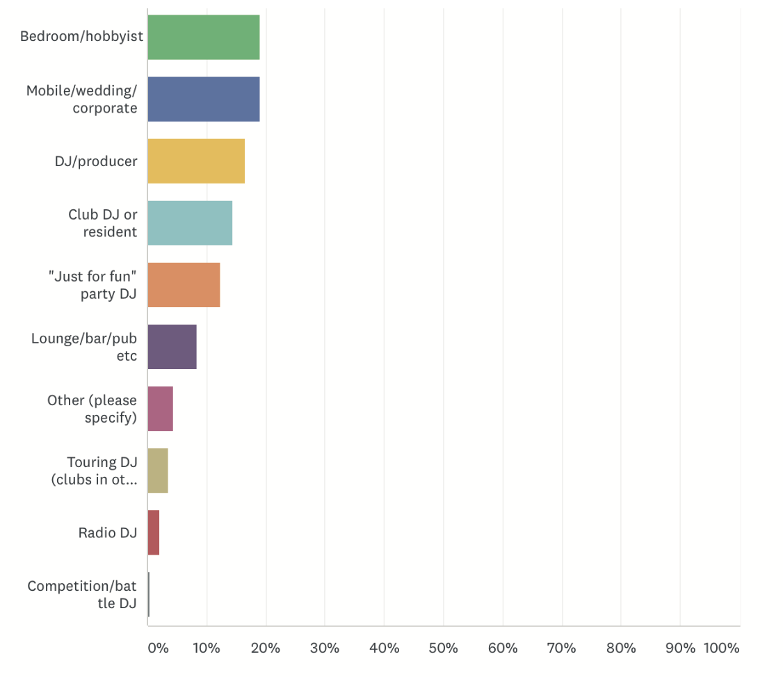 Hobby DJs are neck and neck with mobile and pro DJs in our readership, followed by those who produce their own music as well as club / resident DJs. I used to be in the latter, though these days I find myself being more of a hybrid DJ/producer and pro DJ doing weddings and corporate shows.