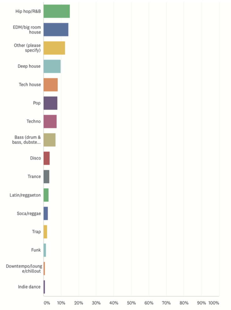 Urban / hip-hop and RnB are huge this year, and they’re the most played genres in our readership followed by EDM / big room and deep house.