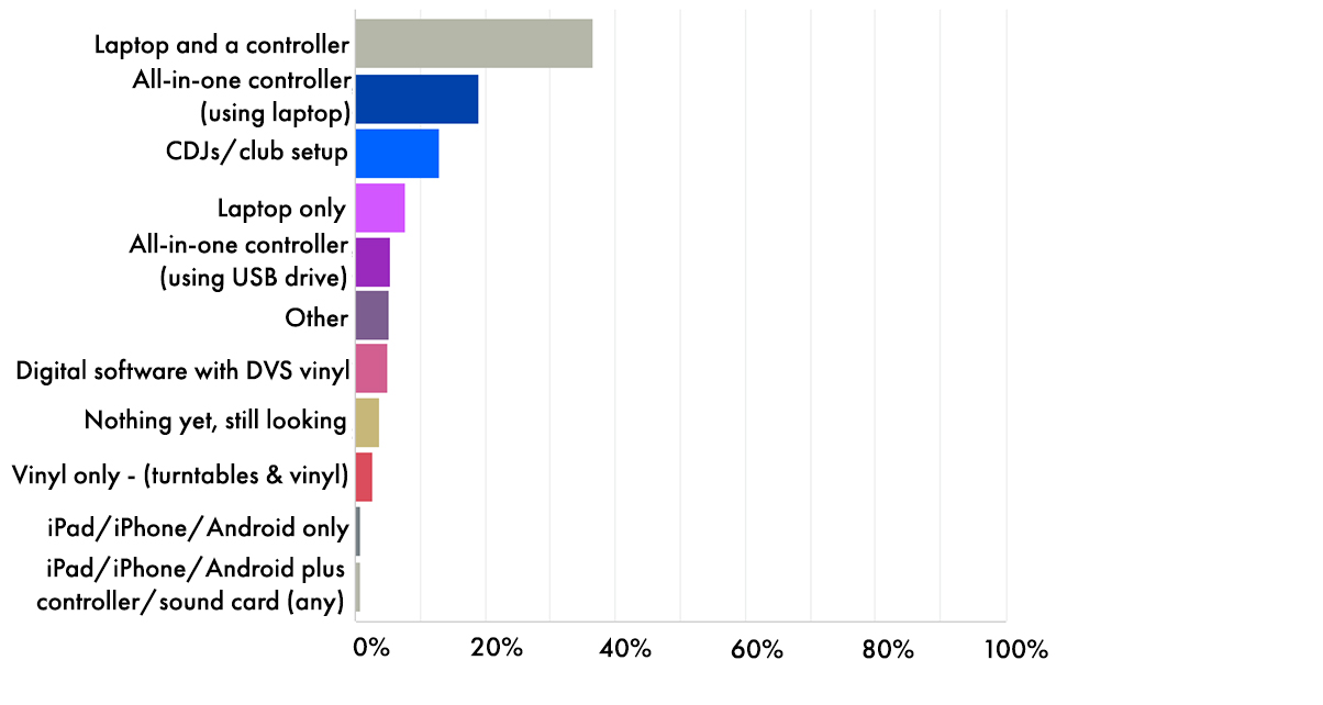 A laptop and a DJ controller is still the set-up of choice for our readers: not surprising because it’s great to start on and is the most cost-effective option. This is followed nowadays by all-in-one systems like the Pioneer DJ XDJ-RX2 and Denon DJ MCX8000, with CDJ-style club set-ups in third place.