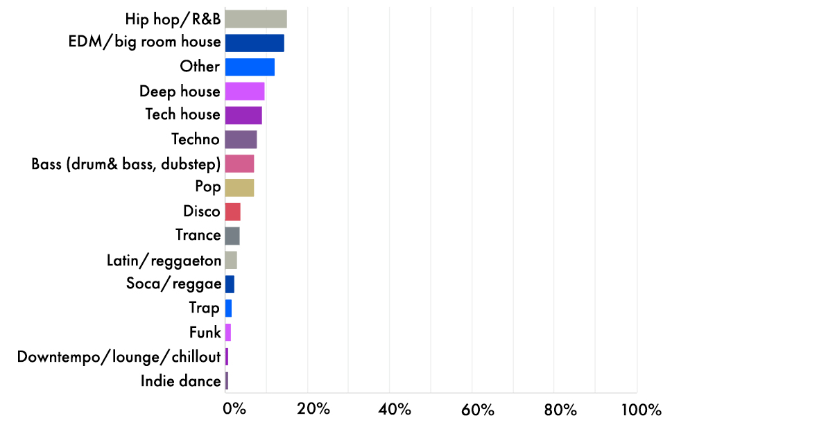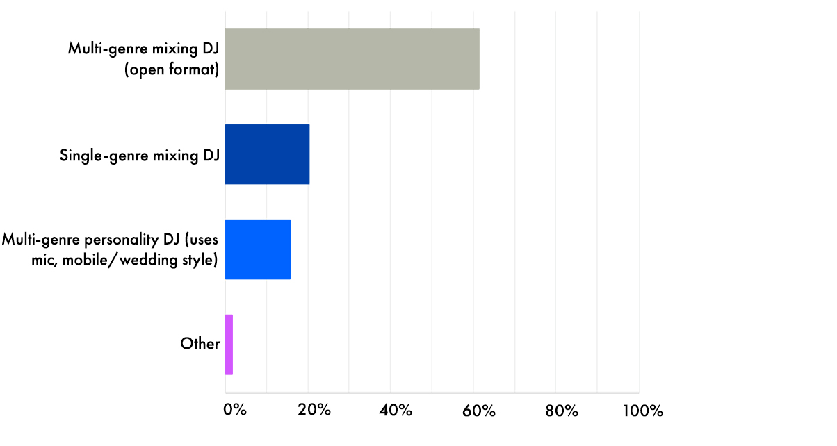 Open-format DJing is currently having its time in the sun, and it shows: a massive 60% of you spin and play multi-genre party DJ sets. Next up are single-genre / focused DJs who specialise in a certain style like house, EDM, and hip-hop, followed by personality / wedding DJs.