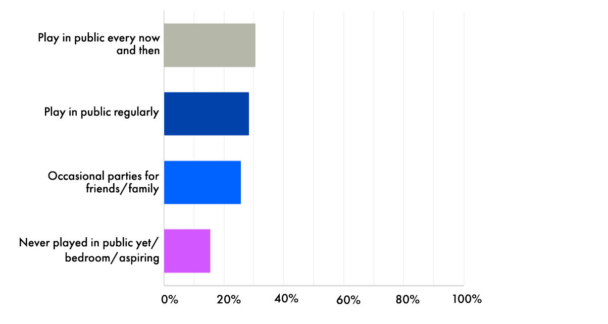 Speaking of hip-hop, urban music claims the top spot in this year’s census when it comes to music played during gigs. It’s followed by EDM / big room house music (for the festival-goers and clubbers). Both these styles continue to be the dominant genres that our readers play, though house and techno are not far behind – and house styles if added up together are arguably the biggest category.