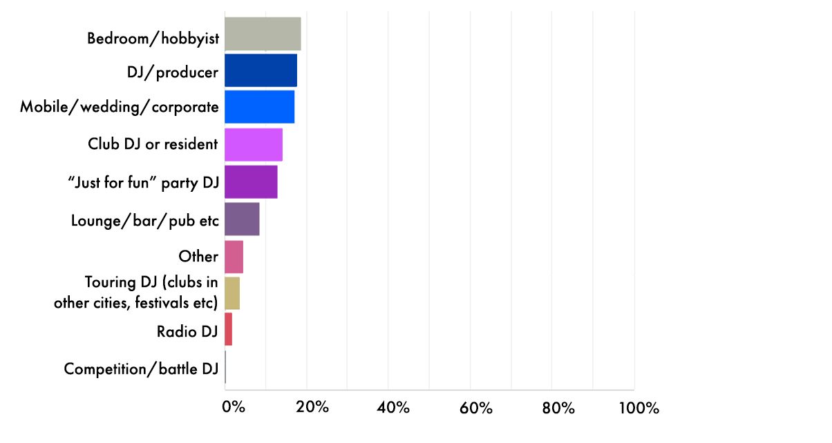 Almost 20% of our respondents are hobbyist and bedroom DJs – basically folk who enjoy playing music at home. They’re followed by DJ/producers as well as mobile/professional DJs who do functions and the wedding circuit. In fourth place are club/resident DJs who play out regularly.