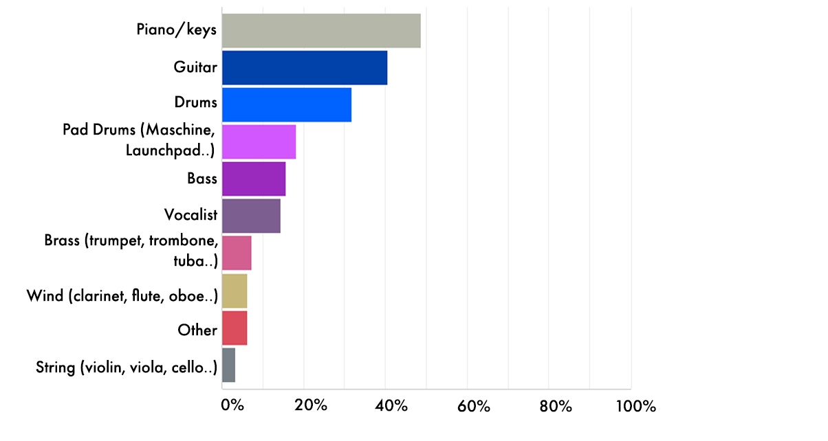 More than half of our readers say they play a musical instrument, and based on the chart above, piano/keys are the most popular, and with good reason: even a basic knowledge of the piano can help immensely in fast tracking the music production process. The next most popular instrument is the guitar (disco / Chic and Daft Punk lovers no doubt), followed by drums (unsurprising because dance music is built on drum beats).