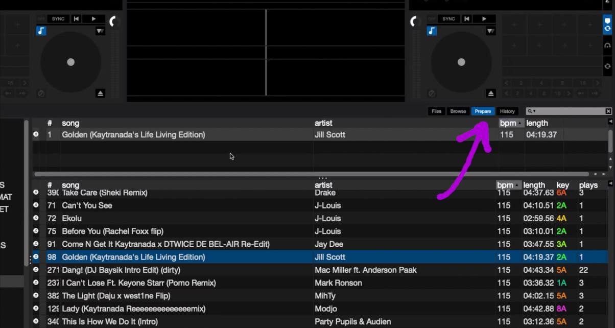 Just like during the days of playing with actual vinyl records, the prepare crate is a “holding place” for possible records to drop during your set. Instead of waiting until you’ve loaded a track to think of what song to play next, the prepare crate allows you to save all the songs you are thinking of playing, all in one place.